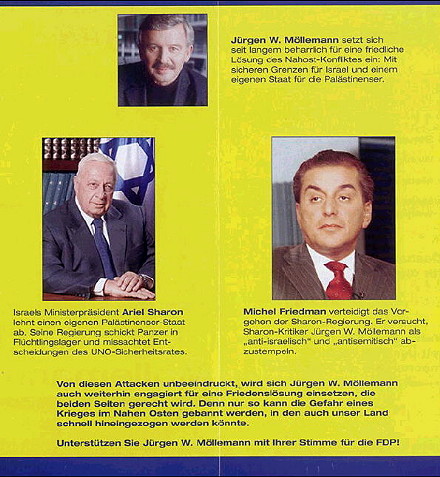 In diesem Zusammenhang kommt es am 23.2.2004 in Den Haag zu zwei parallel stattfindenden Demonstrationen, eine gegen den Mauerbau sowie eine für den Mauerbau und gegen die Befassung des Internationalen Gerichtshofes mit diesem Thema. Die Position von haGalil zu diesen Fragen erschließt sich über einen Artikel vom 9.12.2003 mit dem Titel 'Israel verurteilt zynischen UN-Beschluss', in dem - ohne jede Distanz - die offizielle Position Israels wiedergegeben wird: "Israel verurteilt die zynische Ausnutzung der Dringlichkeitssitzung der UN-Vollversammlung, die der Wahrung des Weltfriedens und der Sicherheit dienen sollte und stattdessen zur Verfolgung der Interessen von Terror-Sympathisanten benutzt wurde... Der Zynismus der palästinensischen Vorgehensweise wird besonders deutlich angesichts der Tatsache, dass nur 90 Länder von den 191 UN-Mitgliedsstaaten, das heißt weniger als die Hälfte, dieser Resolution zustimmten - einer Resolution, die Israel, Opfer des palästinensischen Terrors, auf die Anklagebank zu setzen versucht, während Terroristen und ihre Unterstützer sich durch die automatische Mehrheit der UN geschützt fühlen können." Der Fall Möllemann Auch die einseitige Auseinandersetzung von haGalil mit Jürgen Möllemann, der es wagt, die Politik Israels unter Sharon zu kritisieren, führt bei Monitor nicht zum Hinterfragen dessen, was haGalil verbreitet. Über Jürgen Möllemanns 2003 bei Bertelsmann erschienenes Buch 'Klartext', in dem er die Kritik an Israels Politik formuliert, lesen wir bei haGalil in einem dort wiedergegebenen Artikel aus 'Konkret' vom Mai 2003: "Antisemitisch ist schon die mehrfach wiederholte Behauptung, wer die israelische Regierung kritisiere, breche ein Tabu und müsse damit rechnen, wegen seiner 'abweichenden Meinung' verfolgt zu werden. Antisemitisch ist ferner die Wahnvorstellung, der Mossad habe gefürchtet, was in Deutschland niemand ahnte oder wünschte, nämlich daß Möllemann nach einem Wahlsieg der CDU und der FDP im Jahr 2002 der neue deutsche Außenminister werden könnte, und sich deshalb dessen Parteivorsitzenden vorgeknöpft."