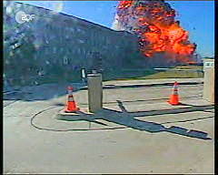 Hier ist der Fremdkörper unter dem Rumpf des Flugzeugs wieder deutlich erkennbar, so daß wir zu dem Schluß kommen müssen, daß es sich kaum um eine normale Boeing 767-222 der United Airlines handeln kann. Anschlag auf das Pentagon Das Thema 'Anschlag auf das Pentagon' wird mit einer Reihe von Aufnahmen einer Sicherheitskamera eingeleitet. Sie sollen am 11.9.2001 - wie wir der Einblendung in den Bildern in der linken Spalte entnehmen - um 9:37 Uhr entstanden sein.