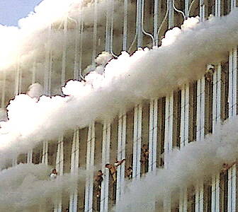 Und auch die Behauptung, es hätten Temperaturen von mehr als 1000°C geherrscht, ist unrealistisch. Die Bilder zeigen Menschen, die sich an die Außenfassade klammern. Sie wären längst verschmort, wenn dort tatsächlich annähernd die behaupteten Temperaturen geherrscht hätten. Einsturz des Südturms Das 'Protokoll des Grauens' zeigt, wie der Turm absolut senkrecht in sich zusammen sinkt - mit Fallgeschwindigkeit - wie bei einer kontrollierten Sprengung. Und der Film zeigt die Staubwolken, wie sie nach außen getrieben werden - wie bei einer Sprengung. Erstaunlich ist zudem, daß die Senkrechtbewegung zustande kommt, obwohl zunächst der obere Teil des Turms in Richtung Kamerastandpunkt zu kippen begonnen hatte. Das scheint nur möglich, wenn das Gebäude unterhalb des kippenden Teils plötzlich weggesackt ist.