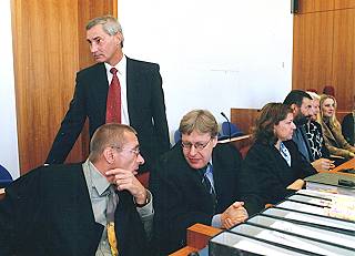 ![]() 9 Bonner Landgericht - Anwälte Ulrich Dost, Heinz Jürgen Schneider und Gül Pinar, dahinter der Vorsitzende des Projektrats, Harald Kampffmeyer |
