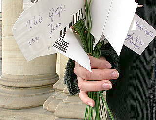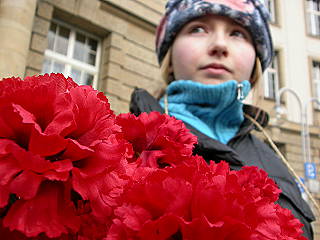 ![]() 15 Menschen heften Friedensgrüße an die roten Nelken - zur Unterstützung der Opfer von Varvarin und ihrer Familienangehörigen |
