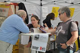 6 Claudia Wangerin, Autorin der 'jungen Welt' signiert am jW-Stand ihr Buch 'Die DDR und ihre Töchter'