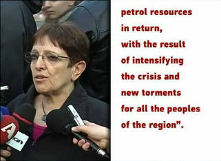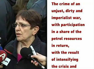 ![]() 20 Aleka Papariga: "..., dem Verbrechen eines ungesetzlichen, schmutzigen Angriffskrieges, durch Teilhabe an den Ölressourcen als Gegenleistung, mit der Folge der Verschärfung der Krise..." |