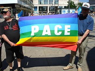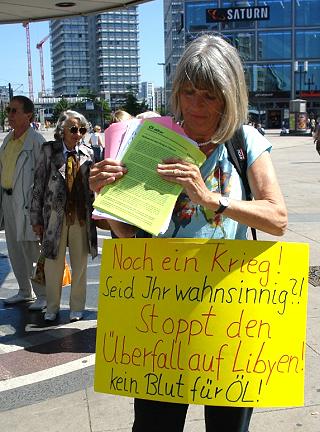 | Berlin, 4.6.2011 (1) - "Hände weg von Libyen" - Protest gegen den völkerrechtswidrigen Krieg der NATO–Staaten gegen Libyen - alle 14 Tage an der Weltzeituhr (Fotos in geringer Auflösung) |