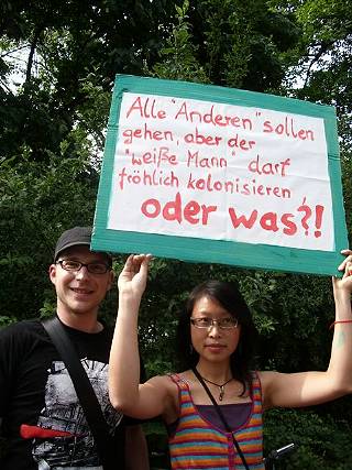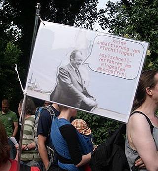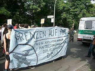 8 "Es scheint nicht zu reichen, dass die Zahl der bewilligten Asylanträge 'dank' der Anderung des Asylrechtes '93 und der sogenannten Drittstaatenregelung weit zurück gegangen ist. Das Flughafenverfahren, also die Inhaftierung von Menschen noch auf dem Flughafengelände, soll nun diese Zahl weiter verringern, um die Abschottung gegen MigrantInnen verschärfen. Entstanden ist dieses menschenverachtende Instrument der Migrationsabwehr im Zuge der Schaffung einer gemeinsamen EU-Grenzpolitik. Deutschland hat auch hier eine Vorreiterrolle übernommen und sich für immer härtere Maßnahmen der Grenzkontrollen stark gemacht, leider erfolgreich. Das Flughafenverfahren wird, wenn es nach der deutschen Regierung geht, zur europäischen Richtlinie werden. Damit wären EU-Staaten zukünftig verpflichtet, beim Bau internationaler Flughäfen auch einen Abschiebeknast zu bauen." | |