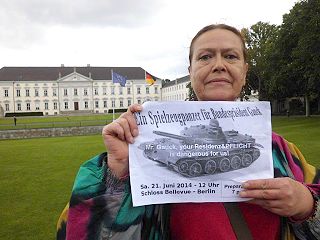 Berlin, 21.6.2014 - Aktion "Ein Spielzeugpanzer für (den vermutlich verwirrten) Bundespräsident(en) Gauck" vor dem Schloss Bellevue