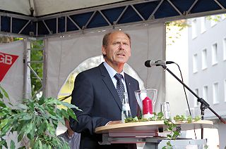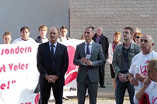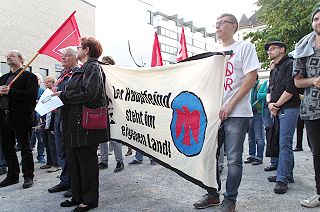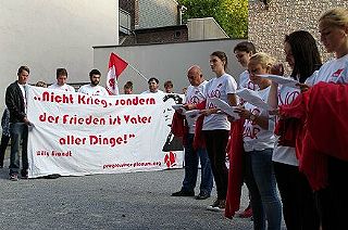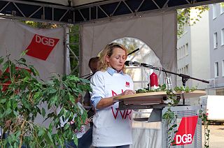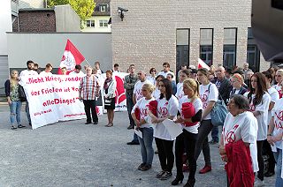 | Gelsenkirchen, 1.9.2014 - "Nie wieder Krieg, nie wieder Faschismus!" - DGB-Aktion zum Antikriegstag auf dem Platz der Alten Synagoge (Fotos: Sven Kaiser) |