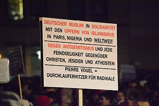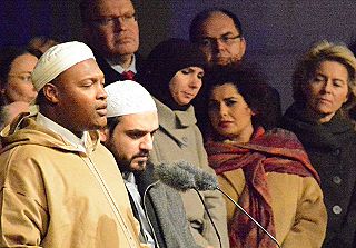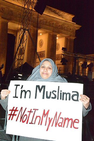 | Berlin, 13.1.2015 - Mahnwache am Brandenburger Tor - "Wir Muslime sagen: Terror nicht in unserem Namen - Zusammenstehen - Gesicht zeigen" (Fotos: Peter Asmussen) |