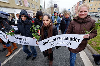 ![]() 14 Der Arbeitskreis Dortmund gegen Rechtsextremismus zieht mit fünf Särgen und 185 Namensschildern, auf denen die Namen der seit 1990 von Neonazis Ermordeten stehen, durch die Stadt |