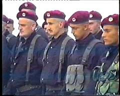 Anmerkung: Inwiefern diese Szene etwas mit der behaupteten Erschießung zu tun hat, ist nicht ersichtlich. Wenn die Zeiteinblendung stimmt, hat sich die 'Segnung' ca. zwei Wochen vor dem Einmarsch der bosnisch-serbischen Truppen in das Gebiet von Srebrenica abgespielt. Ob auf dem Bild ein Mitglied der so genannten Skorpione zu sehen ist, läßt sich nicht erkennen.